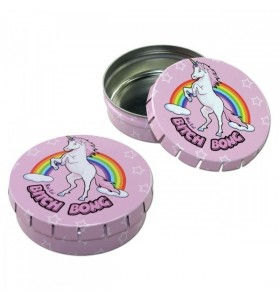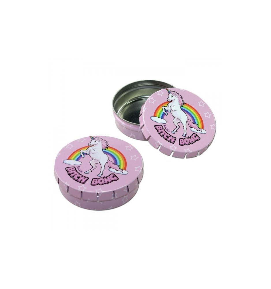 Scatolina Click Clack con tappo dentato pratica per proteggere il prodotto comodamente in tasca. La simpatica grafica è opera dell'artista Sly.