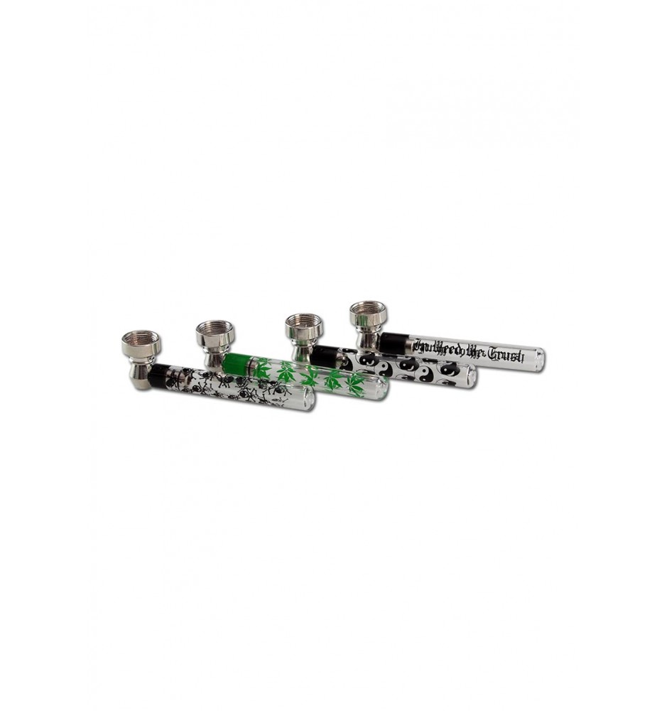 Singola Pipa di vetro con braciere in metallo, lunga 92mm. Disponibile con varie decorazioni sul gambo. Comprende già un filtro di metallo a retina.