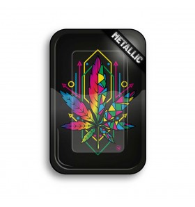 Questo vassoio di metallo è robusto e ha una grafica accattivante che raffigura foglie di cannabis in stile geometrico.