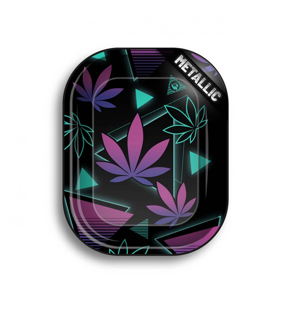 Piccolo vassoio di metallo, robusto e portatile per rollare con comodità. Ha un design accattivante con foglie e forme geometriche in stile synthwave.