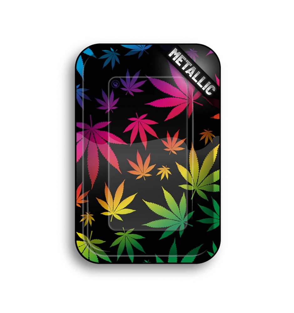 Questo vassoio di metallo per rollare vi colpirà per la lucentezza delle decorazioni a foglia di cannabis arcobaleno.