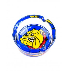 Posacenere ufficiale The Bulldog con logo colorato su sfondo blu.