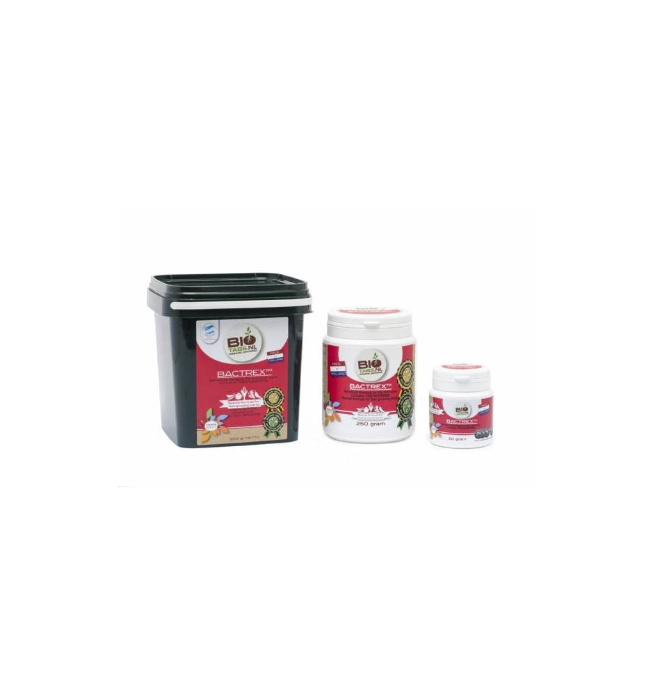 Bactrex è una polvere solubile in acqua con un'alto numero di microbi benefici al suolo e alle radici (con 6 varietà di Bacillus spp.), funghi (Trichoderma) e attinomiceti. Questi ingredienti sono soprattutto selezionati per i loro effetti favorevoli alla struttura del suolo e alla sua fertilità. Questi batteri specializzati per il suolo sono "confezionati" in estratti solubili di Yucca e in catalizzatori organici che garantiscono la rapida colonizzazione e crescita delle radici.