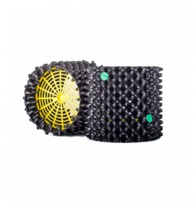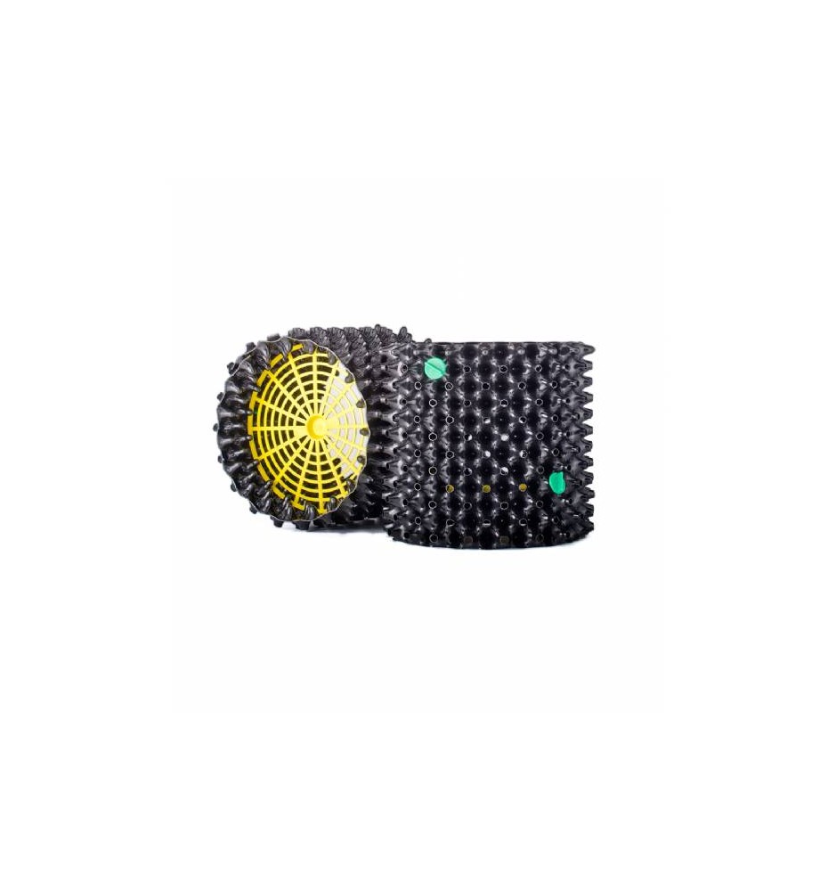 Il suo lato esterno è costituito da tondeggianti coni, bucati centralmente, in grado di attivare il meccanismo detto di auto-potatura delle radici, che consiste appunto nella potatura di queste a contatto con l’aria. Si promuove così lo sviluppo di un nuovo apparato radicale più filamentoso e più consistente, nonché tale da evitare tutti i processi di spiralizzazione.