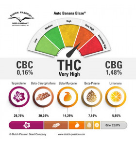 La varietà autofiorente della Banana Blaze è potente quanto l'originale fotoperiodica. L’effetto è potente ed il gusto dolcissimo e fruttato, molto simile a quello di una banana.