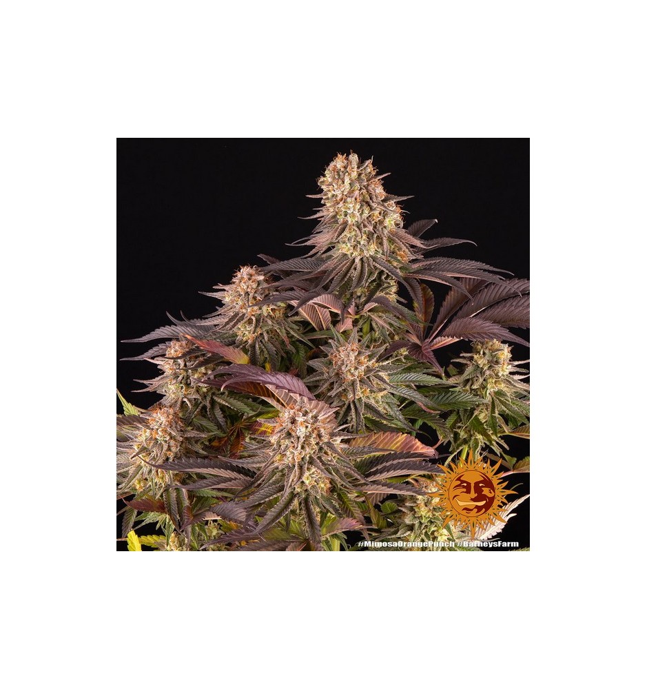 MIMOSA X ORANGE PUNCH™ di Barneys Farm. L’evoluzione di Mimosa continua con questa nuova meraviglia super compatta dall’esplosivo sapore di arancia, ecco a voi un’altra nuova super varietà del laboratorio Barney’s Farm. È stata sapientemente creata da un ulteriore e attento back crossing della famosa Orange Punch con la sensazionale Mimosa Evo. Questo ulteriore apporto genetico ha permesso di ottenere una pianta dalla produzione incredibilmente rapida di cime dal profumo meraviglioso; i terpeni di beta-cariofillene, lianool e limonene creano un sensazionale aroma dolce di agrumi e mandarino. Questo incrocio ha prodotto una pianta ancora più compatta rispetto a Mimosa Evo ma che riesce a mantenere una performance di produzione sbalorditiva. Senza dubbio una delle versioni più colorate della Collezione Cali di Barney's Farm. L'aspetto della mostra eleganti gradazioni di viola, una tale bellezza si vede raramente nel mondo delle piante, una vera e propria delizia estetica anche per i coltivatori più esperti. Questa campionessa sarà una assoluta gioia, una pianta molto robusta che produce molte cime grandi, dense e altamente resinose ricoperte di pistilli arancione chiaro grondanti di tricomi. Durante i test è stata descritta come un sogno per il coltivatore indoor! Un periodo di fioritura rapido di appena 55-60 giorni produce 700 g/m2. In condizioni outdoor ideali MIMOSA X ORANGE PUNCH™ raggiunge altezze di 1.5m – 1.8m producendo oltre 1,5kg di cime molto compatte di squisita e deliziosa cannabis. La misurazione del THC ha dato un incredibile 30%.